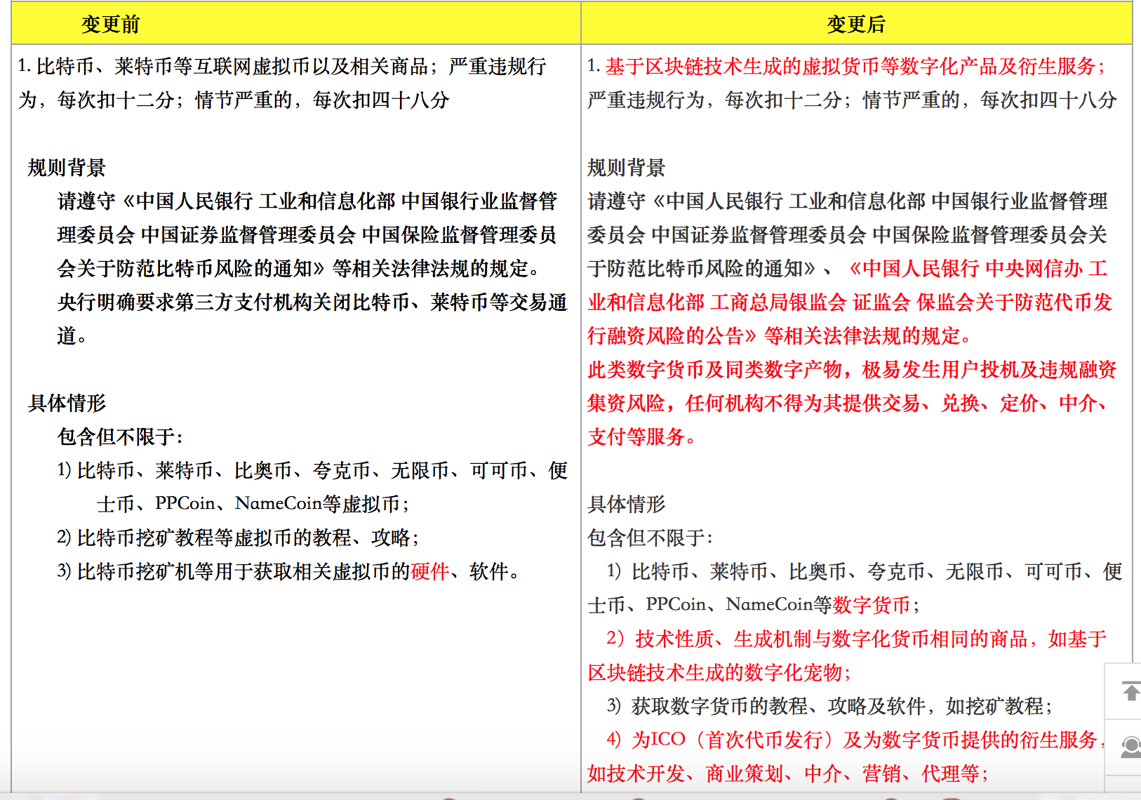 变更后,具体情形中“虚拟币”被改为“数字货币”,增加了禁售数字化宠物等技术性质、生成机制与数字化货币相同的商品以及ICO相关的衍生服务。与此同时,对于比特币挖矿机等用于获取相关虚拟币的硬件的条款未被提及。