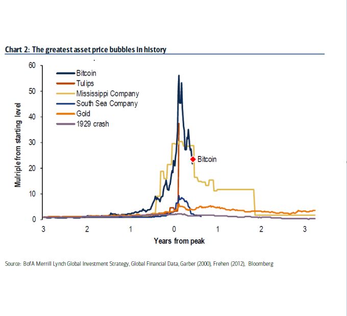 美银美林首席策略师Michael Hartnett指出,如同郁金香泡沫、南海泡沫,比特币正追随这些史上其他大规模泡沫的脚步,开始崩溃。