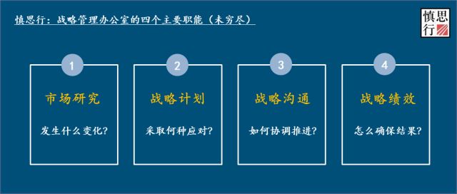 但这其中真正的挑战在于:最高决策层的个人战略意识如何与组织结合?植入组织的生态体系之中,因其特殊性并无定式可以追寻与照搬。当然,亦可以照搬上面所说的四个标准模块去构建战略管理办公室的工作,但是这样就为战略创造价值保驾护航了吗?答案显然是否定的。对于已经有专职战略管理者(战略总监/战略总经理/战略副总裁)任职的企业来说,我们之间探讨最多的关键问题——你打算如何演进战略管理职能以匹配公司发展的需要?而对于很多还没有专职战略人员的组织而言,也不用着急,战略管理办公室既非必备,也并非当下的唯一答案,关键问题是最高决策层准备好了吗,以及当下组织的现状需要专职的团队来植入组织战略意识了吗。