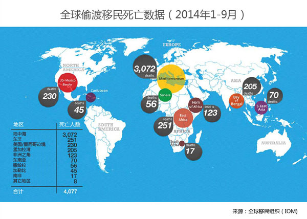 报告发现,欧洲是迄今为止对偷渡客(国际移民组织称之为“无序移民”)来说最为危险的目的地,今年死亡在地中海到欧洲路途上的偷渡客已经超过了3,000人,而2013年这个数字只有700左右。