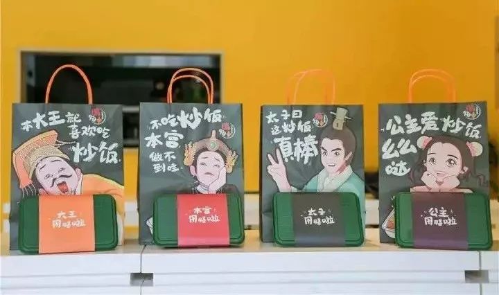 隋炀帝炒饭用5款炒饭做出了单店万单的成绩,得益于围绕着“隋炀帝”这一形象,为每款产品塑造了不同的古装人物卡通造型,并利用吸睛的手绘包装袋和搞笑文案的组合,吸引年轻人的关注和转发,提高了品牌的曝光度和传播度。