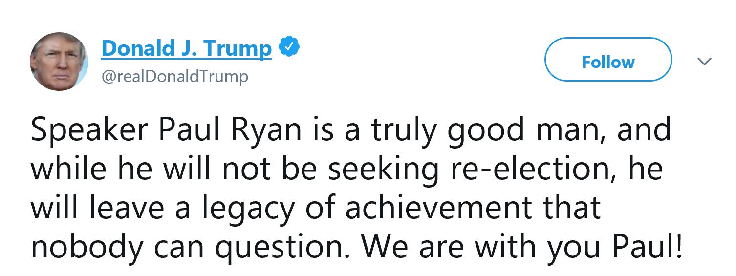 在他公布离任决定后,许多共和党人表达了对瑞安的赞许和不舍。特朗普也在推特上表示:“议长保罗·瑞安真的是个不错的人。虽然他不会再寻求连任了,但他留下了无可非议的成就。与你同在,保罗!”