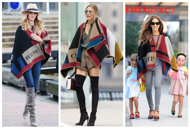 别以为只有大长腿才有资格披毛毯,霍比特人一样能赶这个时髦。且看来自秀场外名人的亲身示范:175cm的“变3女郎”Rosie Huntington-Whiteley,168cm的纽约名媛Olivia Palermo,和163cm的Sarah Jessica Parker。“维秘天使”出身的Rosie作为长腿星人的佼佼者,只靠修身仔裤,麂皮长靴和一顶毡帽,单手随意一搭披肩就轻松营造了摩登时髦女郎的形象。Olivia Palermo应该是第一个把毛毯穿上街的名人,她选择了过膝长靴和呢子短裤的搭配,拉长了腿部线条比例。而身形娇小的SJP,一身条纹T恤和仔裤的休闲装扮就化解了气场上的不足,身旁的两个娃还是最好的配饰和显高参照物。当然无一例外的,她们的Burberry Prorsum披肩上都绣着自己名字的首字母,别忘了专属定制也是这块毛毯最大的卖点。