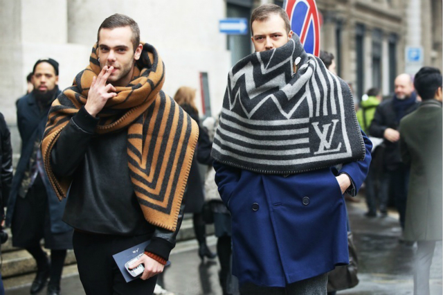 但披肩套头穿法毕竟还是太民族,Burberry Prorsum给男人们出的搭配方案是,在各种正装休闲装之外披搭、并且只披一半才时髦。这显然还是太过刻意。在Louis Vuitton秀场外,各路型男的选择就实用保暖得多,把毛毯或绕或盖围成各种样式套在颈间。成功的要诀就一个,轻松不刻意。