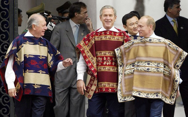 实际上比T台模特更早披上了披肩的,是男人们,而且是政要大佬们。早在2004年智利APEC峰会上,各国首脑就统一身披当地传统套头披肩“查曼多”。据说,这种丝线和羊毛混织而成的传统服饰,每件需要手艺人连续工作4个月才能做成,制作成本大约是1400美元。看小布什、普京和智利总统拉戈斯身穿披肩站在一起时,简直就是拯救世界的蝙蝠侠嘛!