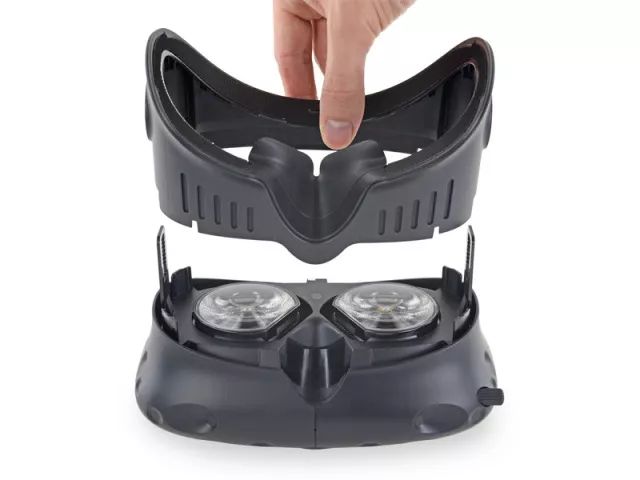 头盔内侧使用了可拆卸的缓冲棉与鼻托,佩戴更舒适。两个目视透镜间有一个距离感应器,可以检测VR头盔是否在佩戴状态,起到省电降温的功能。