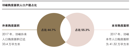 数据显示,2017年,邛崃商品房累计实现销售8261套,销售面积约74.74万㎡,实现销售金额约37.12亿元,同比增长约23.9%。其中全市外来购房面积约33.41万㎡,占购房总量的44.7%,同比增长近9.49个百分点,市场内生结构变化将引导出更多的住房需求。
