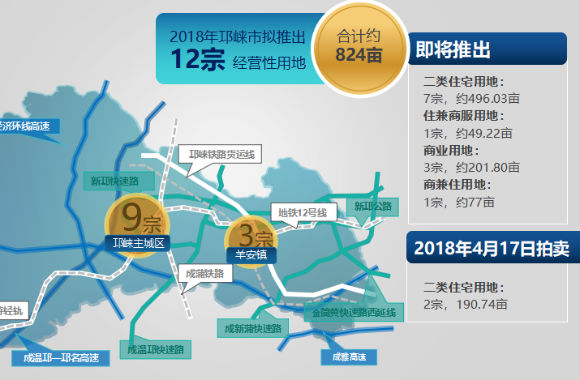 本次推介土地共划分为五大片区,12宗地共计824余亩,其中9 宗来自城市配套成熟的邛崃主城区,3宗来自潜力可期的羊安现代产业新城片区。