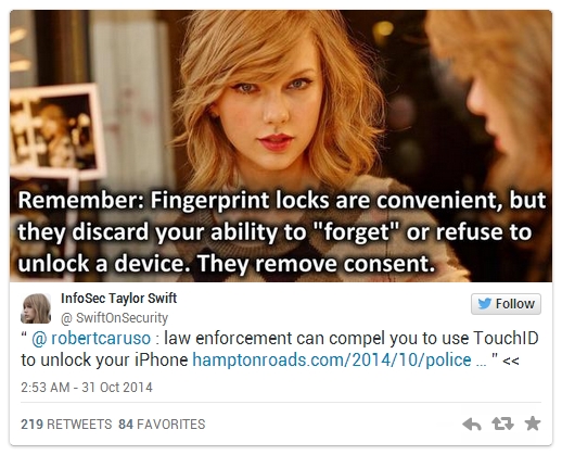 Fakhoury在法律新闻杂志的一篇文章中就警告说指纹是不受法律保护的。而一位互联网和隐私律师Marcia Hoffman,也在接受Wired采访的时候说过同样的话。“我们不能援引反对自证其罪的特权,来阻止政府收集像指纹、DNA样本或声音等生物特征信息。”Hoffman写道。“为什么?因为法院早就裁定这些证据不会透露任何你知道的事情。”