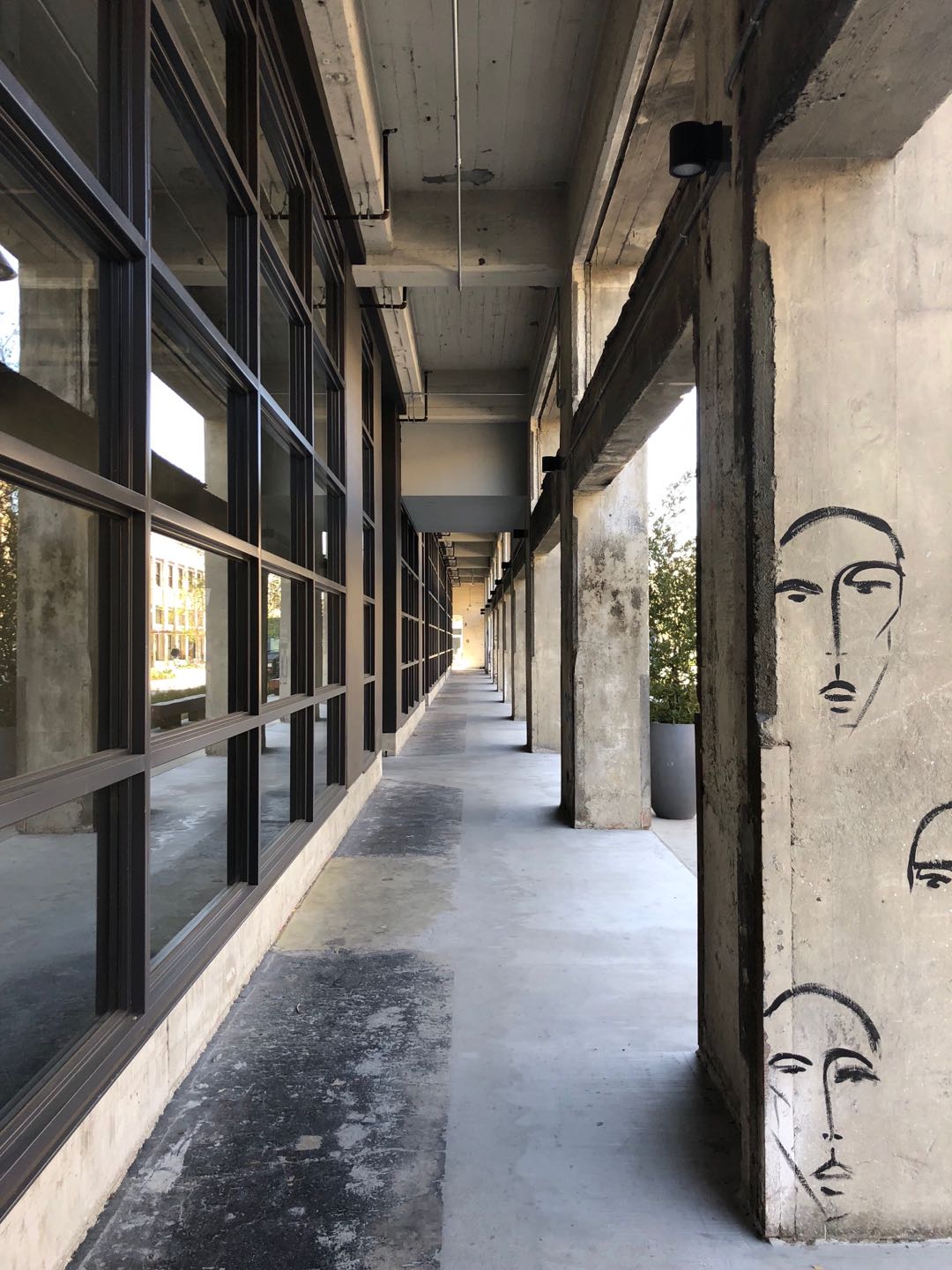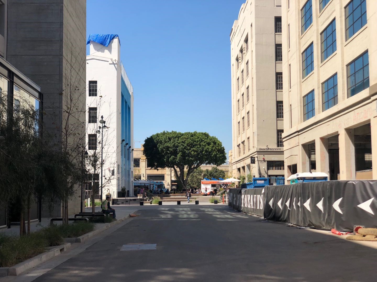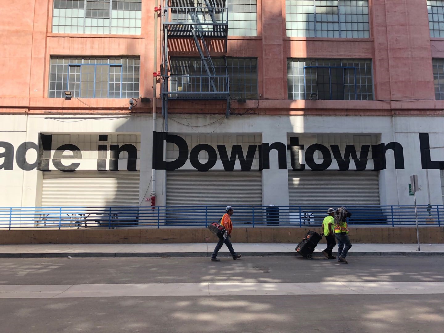 中午十二点半,我走进了洛杉矶市中心灰狗长途汽车站对面的一个旧工业园。时值正午,偌大的园区并没有太多行人和车辆进出,只有入口处关停不久的American Apparel工厂大楼门外停着两辆水泥卡车。附近不远,六七个穿戴着劳保用品的拉美裔建筑工人刚吃完午餐,坐在水泥台阶上一边晒太阳一边享受开工前的闲适。