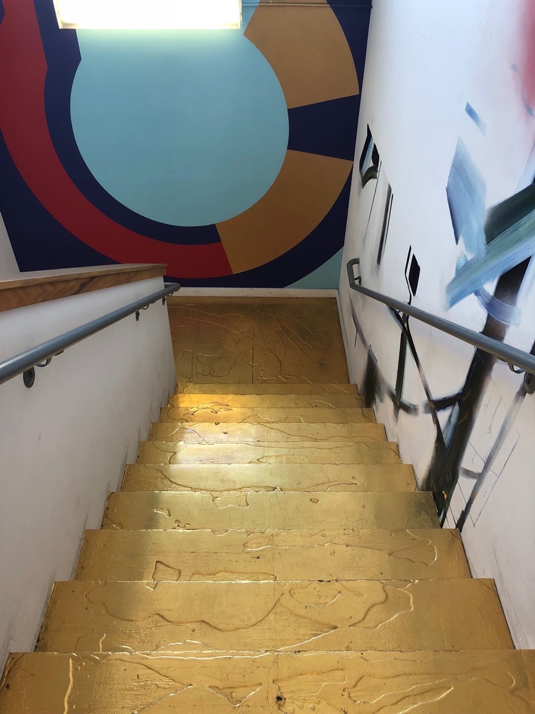 艺术廊里也是一片金色的海洋。室内整个墙面上贴着一片片金箔似的细片,让整个屋子看起来亮堂而又温暖,而正中间深黑色的墙面上还毫无规则地镶嵌着大小和形状各不相同的金色金属块。正当我看的入神,一位小麦色皮肤、银白色头发和络腮胡的中年男子走了上来,他说自己是屋内艺术品的作者,见我饶有兴趣,自豪地来跟我介绍自己的作品。