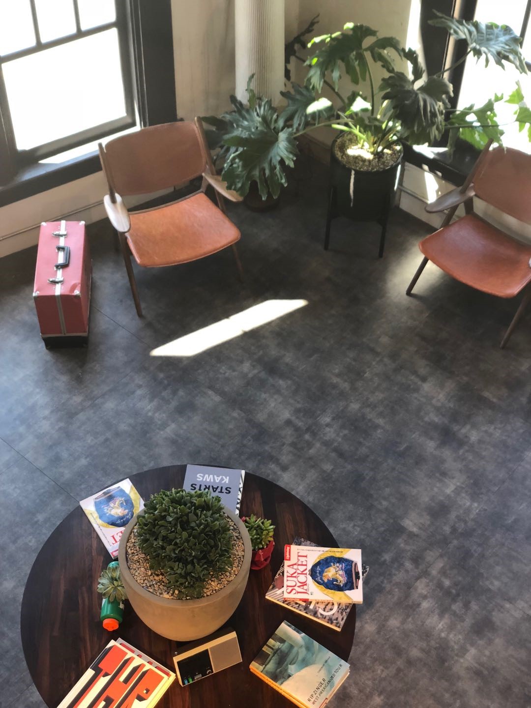 我没来得及仔细看都有哪些潮货,Mia先领着我上了楼梯,说还有更多好玩的东西等着我。走上二层,我发现这里是一个小的平台区域,在平台的中间放着一些和设计相关的书籍,靠墙的地方摆着几盆绿植和两张小沙发,角落里还有一台黑胶唱片机和卡带机。我问Mia这些机器是不是还能用来放音乐,她回答:“你有兴趣的话可以试试。”