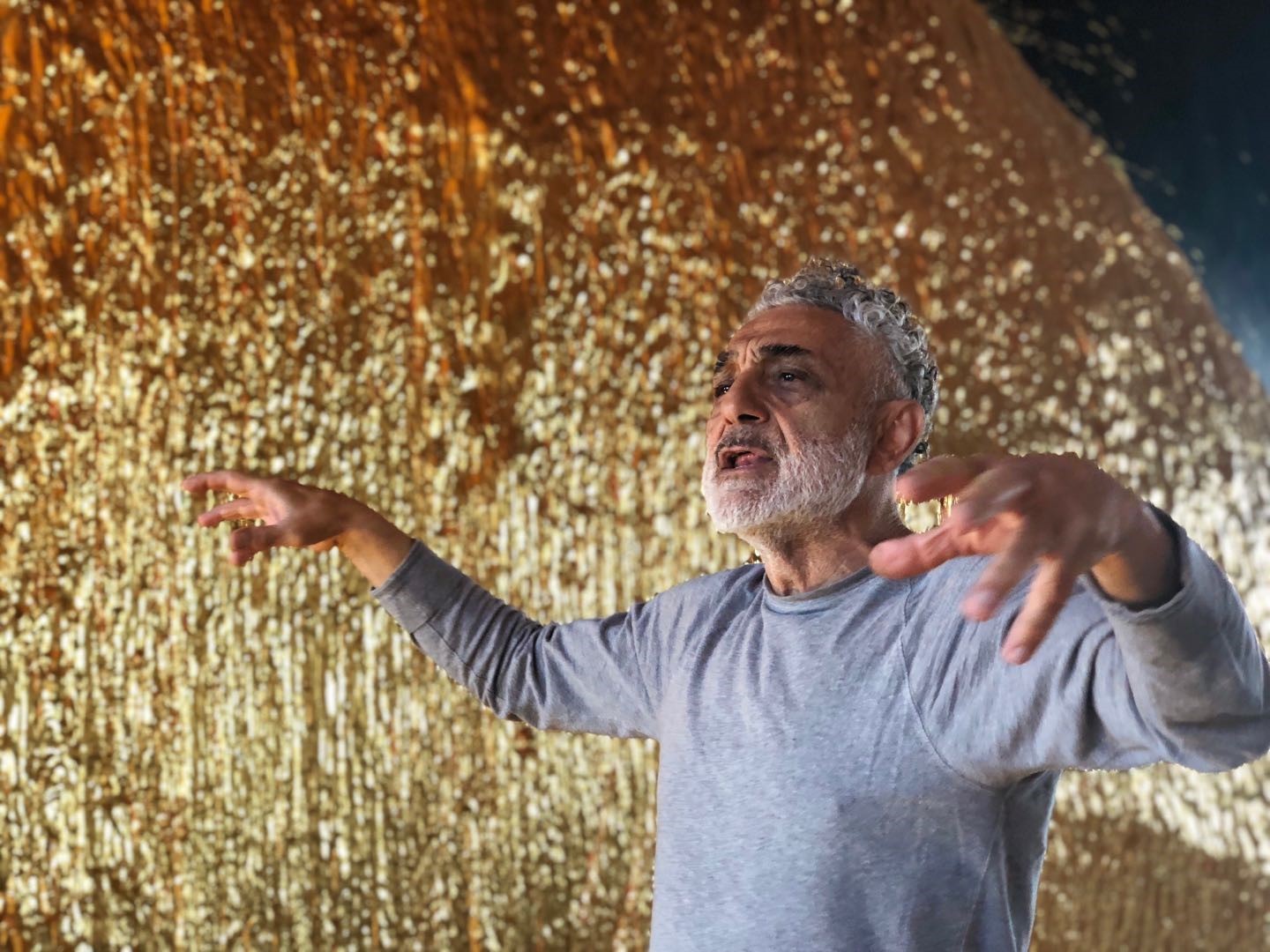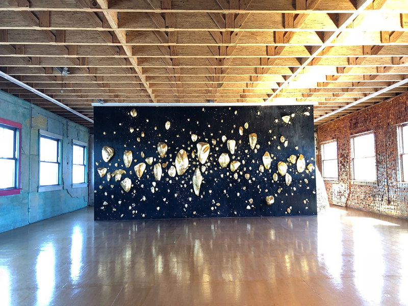艺术家说,金色是他喜欢运用的颜色,所以把进门的楼梯和屋内的墙面都做成了亮眼的金色;在展厅的另一面有一副鎏金的铜制作品,表现的是喷薄而出的旭日;而我驻足观看的黑底嵌金作品,是他自己潜意识中看到的景象,走近看会发现每一个形状各异的金属块都是一张立体的面孔,嵌在黑色的背景板上,远远看去又像是遍布繁星的整个宇宙。