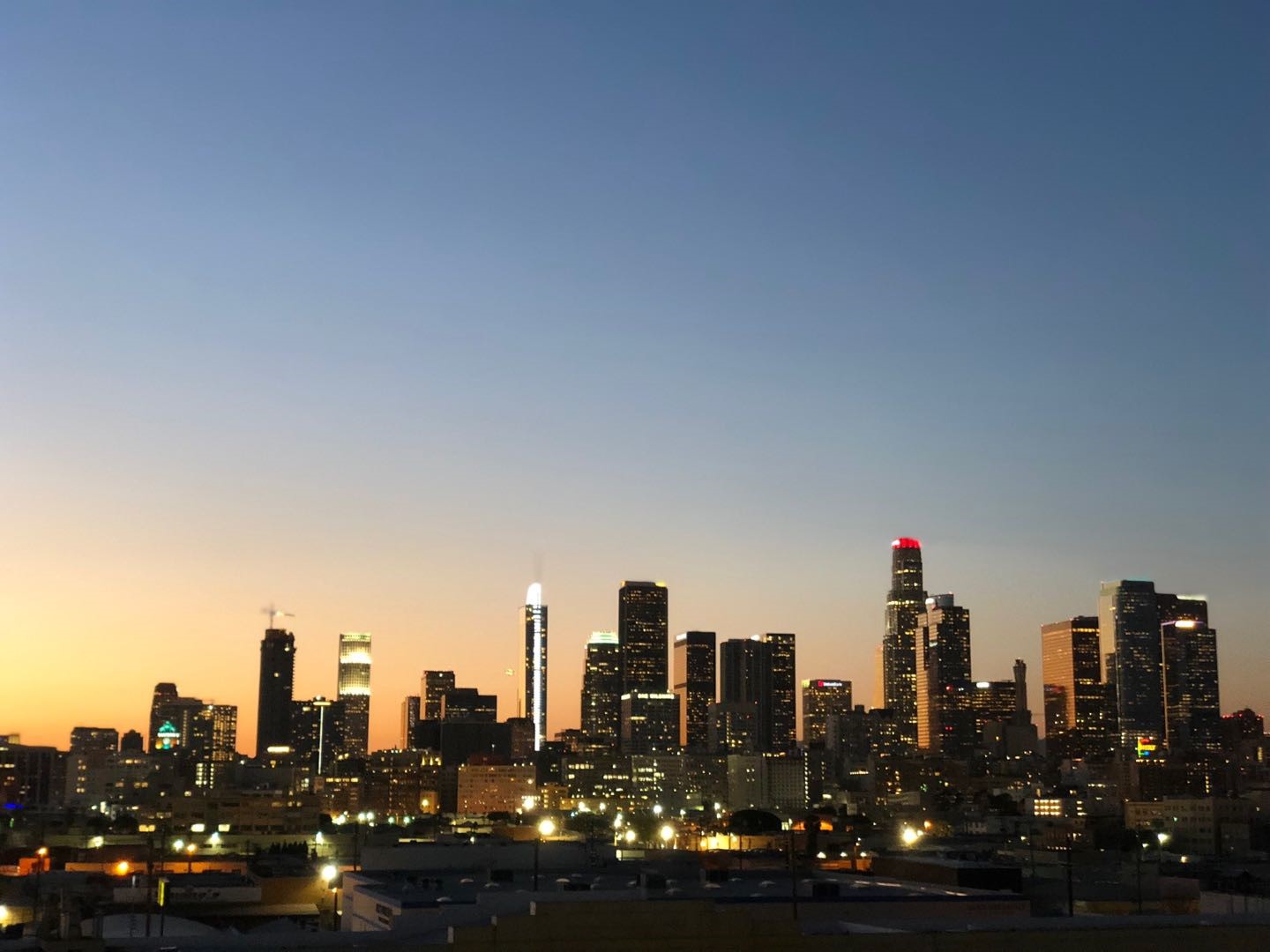 回到园区里,我看很多人都在向一栋高楼走,才得知当晚在这栋建筑的楼顶会有一个“街头美食电影院(Street Food Cinema)”的电影展播活动。我跟着大家一起上了顶楼,远远看去华灯初上的洛杉矶仿佛融在了点点星光里。