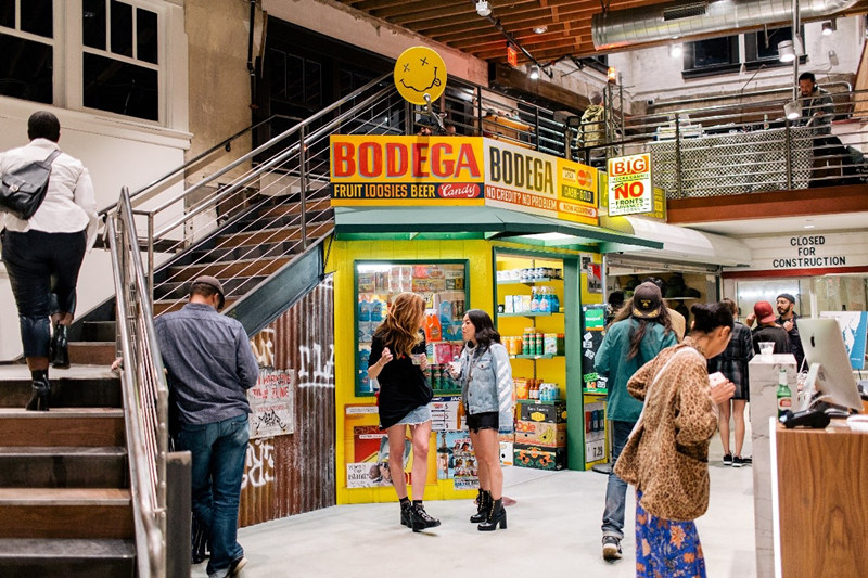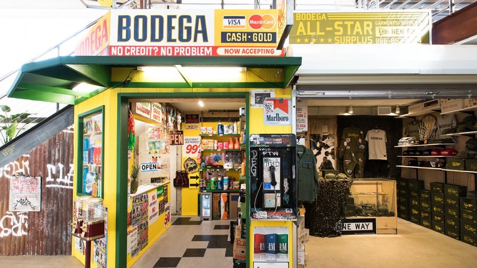 店员名叫Mia,她告诉我所在的这家店就叫“杂货店(Bodega)”,是一个以美式复古杂货店为装修风格的时尚潮流鞋服铺子。Mia先带我走到我最为好奇的那三个小屋,我看到每个仿照杂货店装修的小屋货架上虽然也摆放着卷纸、肥皂、汽水、打火机之类的生活杂物,可真正的货品却是那些设计师品牌的T恤、卫衣,美国球类联赛的帽子,以及众多最新款式的运动鞋。我问Mia这些鞋子都有什么品牌,她笑着说我能想到的运动潮牌这里都有。