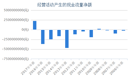 梳理荣盛发展财报发现,其经营活动产生的现金流量净额连续数年为负值,且流出额在近年来不断扩大:从2014年的-16.61亿元扩大至2016年的-36.95亿元,2017年前三季度则为净流出75.71亿元。不过,根据荣盛发展最新发布的2017年财报,其2017年经营活动产生的现金流量净额为22.74亿元。