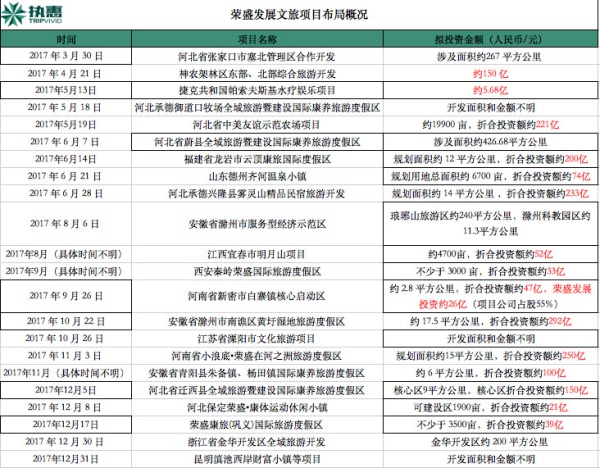 如上所述,自2017年3月末至2018年4月初,一年间,荣盛发展(拟)布局文旅项目已达28个,拟投资(含部分有意向,但还未最终落定的项目)概算金额已近2000亿元。