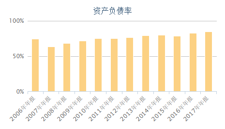 结合荣盛发展的各年度年报(季报),可发现其资产负债率从2012年的76.56%增至2017年的84.68%。2017年荣盛发展总资产1917.33亿元,总负债1623.53亿元。