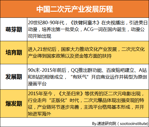 1980年12月央视首次播放《铁臂阿童木》以及之后对美日漫的引进,培育了国内第一批二次元受众群体,二次元行业在中国开始萌芽。国家对文化产业的扶持,也在一定程度上助力二次元行业的发展。二次元行业的发展历经几十年,终于迎来爆发期。