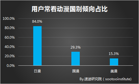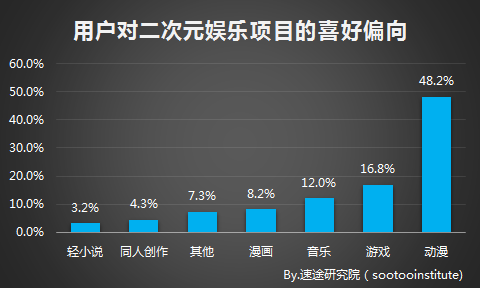 二次元所涉及的领域很广,从用户的喜好偏向来看,最受用户关注的前三分布是动漫、游戏和音乐,其中有接近一半的用户钟情于动漫,游戏和音乐的占比分别是16.8%和12%。国家最初引进的便是动漫作品,因而第一批二次元受众深受动漫的影响,这也是二次元动漫备受追捧的原因之一。