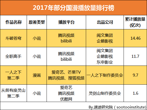 2017年出现许多爆款国漫,首屈一指的当属《斗破苍穹》,其累计播放量达14亿,根据蝴蝶蓝同名小说改变的《全职高手》也取得优良的成绩,这两部作品的第二季还入围2018年最受关注的国漫Top10榜单,其影响力广泛且深远。此外,连载国漫《狐妖小红娘》累计播放量已超过26亿次。