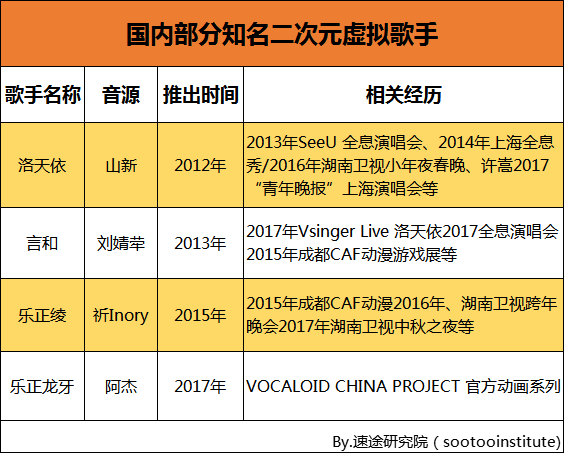 2012年中国也首次推出虚拟偶像洛天依,随后还推出了其他的虚拟偶像,均取得不错的反响。这些虚拟偶像的音源都是由优秀的歌手或者专业的配音演员所提供,对于二次元用户来说无疑是一场听觉的盛宴。