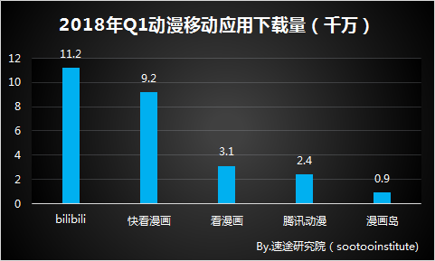 根据下载量显示,2018年第一季度bilibili的下载量最为领先,紧随其后的是快看漫画,看漫画的下载量位列第三,而腾讯漫画退居第四。bilibili作为“专业”的二次元平台,拥有最高下载量是毫无争议的;快看漫画主要以轻度内容为主,轻松抢占用户的碎片时间,实现弯道超车。现阶段各大应用基本结束“圈用户”阶段,如何留住用户,使其感受到归属感则是首要任务。