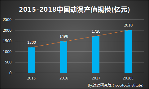 由于动漫是否为二次元作品的界限模糊不清,在此根据整个动漫产值规模以作分析。根据2015-2018年国内动漫产值走势图可以看出,国内动漫产值规模总体是呈上升趋势,根据其稳定增长的特征可以预估,到2018年国内动漫产值将超过2000亿元。