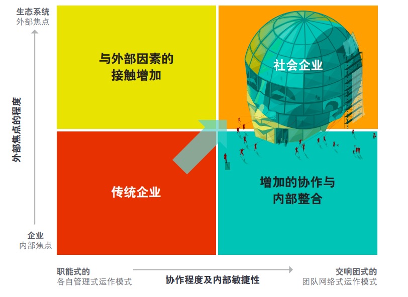 从商业企业转变为社会企业,是普通公司进化为“企业公民”的过程。这要求管理者塑造出一个足够警觉的组织,倾听、投资并积极管理当今世界的趋势,促进生态系统中各个层级的高度合作。74%的受访高管相信,比起政府或者其他组织,企业将有更多的影响力来塑造出这样的未来。