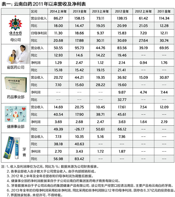 包括白药气雾剂系列核心药品在内的药品事业部,因种类较多公司财报只披露了营业收入情况,未公开2013年以来的利润情况。该事业部2011-13年营业收入分别为30.87亿元、36.92亿元和44.21亿元,2012和13年的同比增长分别为19.6%和15.6%。但到今年上半年营收仅为20.72亿元,同比仅7.1%。