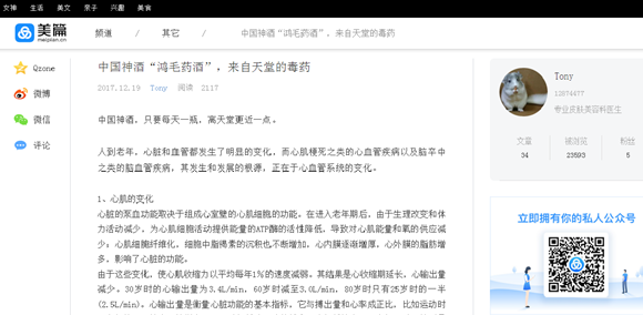 2017年12月,广州医生谭秦东在图文创作分享应用APP“美篇”上发表《中国神酒“鸿毛药酒”,来自天堂的毒药》(以下简称《毒药》)称,“鸿毛药酒”广告的主要消费者基本是老年人,老年人退休后很多消遣时间项目就是电视,鸿毛药酒真是渗入人心。