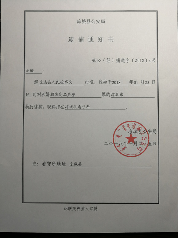 2018年1月25日,内蒙古自治区凉城县公安局以涉嫌损害商品声誉罪对谭秦东实施逮捕。