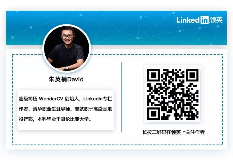 本文由LinkedIn原创,作者朱英楠David。超级简历 WonderCV 创始人,LinkedIn专栏作者,清华职业生涯导师,曾就职于高盛香港投行部,本科毕业于哥伦比亚大学。