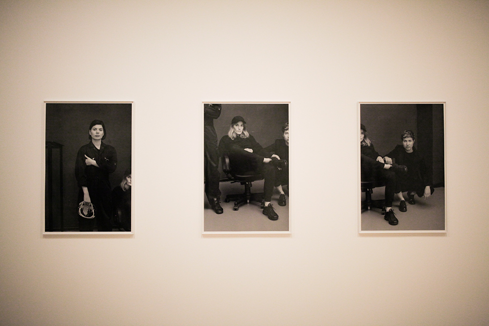 出生在波兰的德国艺术家 Andrzej Steinbach 用一篇德国社会学家的论文命名了自己的作品:三人便是社会。这个作品有两组照片,每组照片中的三名模特穿着不同的工装服,一名站着,一名坐着,一名蹲着,一字排开,每个模特都有一张特写。两组照片中,只有模特的位置变了,而每个位置的衣着不变——也就是说,第一组照片中站着的模特在第二组照片中蹲下后,衣装也换上了第一组照片中蹲着的模特的制服。Steinbach 以此来表达,人是可以互通易变的,就像他们在社会中与他人的关系一样。