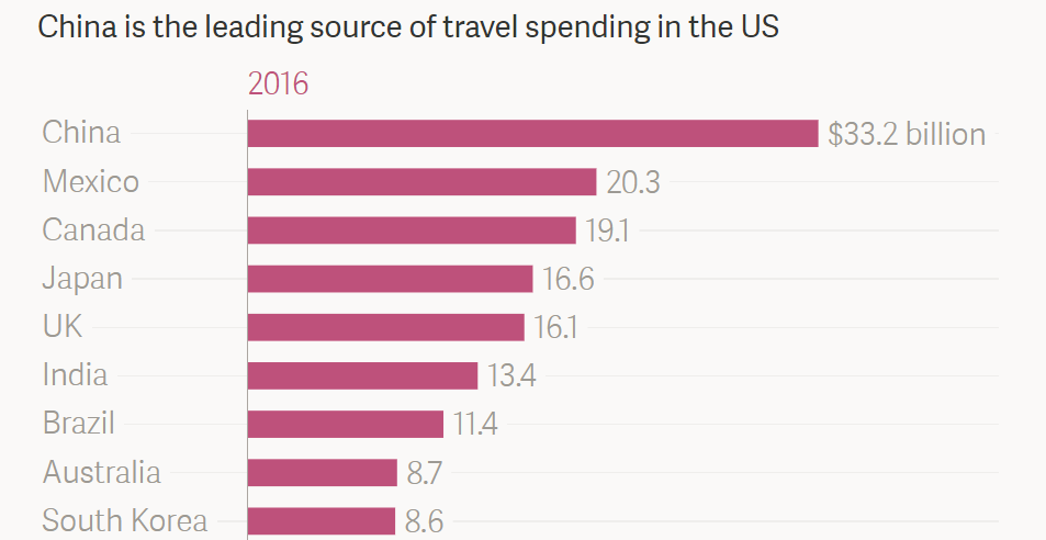 相比之下,2016年,到中国旅游的美国人在中国的花费却只有54亿美元。这就意味着,美国对华的旅游服务贸易录得约280亿美元的顺差。