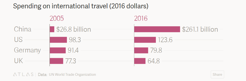 2007年之前,中国游客在美国的消费支出还不及美国游客在中国的花费。例如2005年,中国人在出国游中的花费不足270亿美元(以2016年美元计)。但是,随着收入增加,近几年来,中国人出国游的消费能力大大提高。2016年,中国游客出境游消费已跃居全球第一。