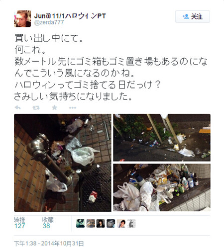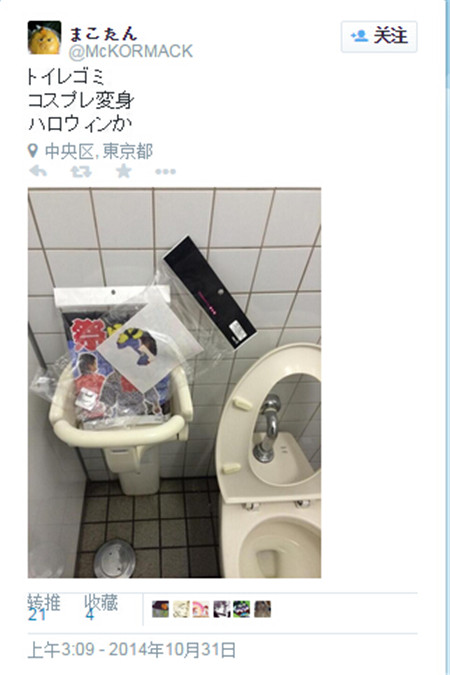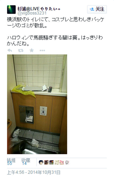 “横滨站的厕所里扔着装衣服的袋子。为了这么个万圣节闹成这样,shit。真心理解不能。”