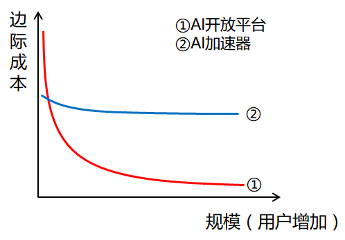 现在,腾讯和百度通过AI加速器“你用我东西,我给你投资帮你解决问题”的方式,培养了优质客户与阿里在客户群上形成了区隔,能够获得差异化优势。但是,问题随之而来,由于单纯开放技术接口的AI开放平台模式追求的是用户量越大越好,越往后每增加一个用户对平台成本支出压力是递减的,用户越多成本越低的“开放”玩法才能把平台做得尽可能大,这是互联网产品的普遍规律。