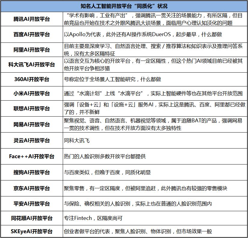 不过,初生时十分高大上的AI开放平台,在跟进者越来越多时,也陷入了某种同质化的竞争当中,很多时候,对“用户”而言,选择进入哪家平台是迷茫或者无所谓的。