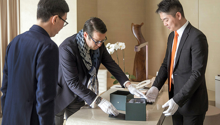 2018年4月9日,有143年历史的高级制表品牌爱彼(Audemars Piguet)在京东开放全球首家线上限时店。4月10日上午,爱彼全球CEO François-Henry Bennahmias与刘强东二人身着正装、佩戴白手套,将一枚全新爱彼皇家橡树离岸型潜水腕表送到爱彼限时店的第一位客人手中。