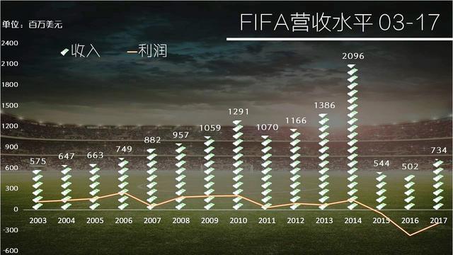 从上图也可以看出,从2003年到2014年,国际足联的营收水平几乎是直线式上涨,在2014的巴西世界杯年,国际足联的营收超过了20亿美元。