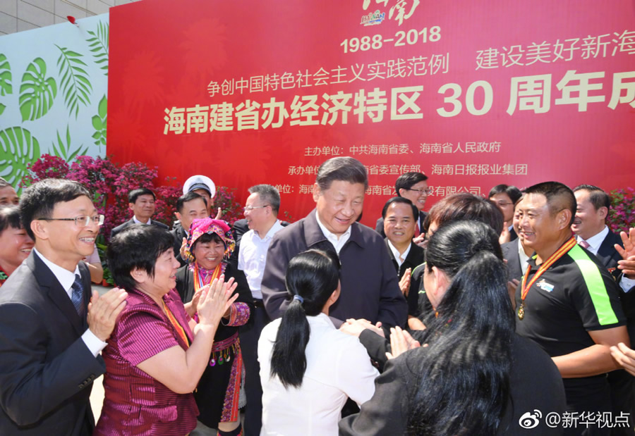 13日上午,习近平来到位于海口市的海南省博物馆,参观海南建省办经济特区30周年成就展。一张张照片、一幅幅图表、一件件实物,记述了海南30年来特别是党的十八大以来在改革开放和社会主义现代化建设方面的成就。习近平不时驻足观看,边走边问,详细了解海南建省以来的发展历程。他强调,贯彻落实党中央决策部署,不是喊口号,要经过深入调研,结合当地实际,形成符合党中央精神的行之有效的具体举措。他深情地对大家说,海南建省办经济特区30年来,从一个欠发达的边陲海岛发展成为我国最大的经济特区和驰名中外的国际旅游岛,改革开放实现重大突破,经济社会发展取得巨大成就,充分证明党中央关于海南建省办经济特区的决策是正确的。今年是改革开放40周年,我们要总结经验、乘势而上,在新起点上推动改革开放实现新突破。海南要充分利用地缘优势、资源优势、生态优势、政策优势,着力在体制机制创新和发展思路模式创新上下功夫,谱写美好海南新篇章。
