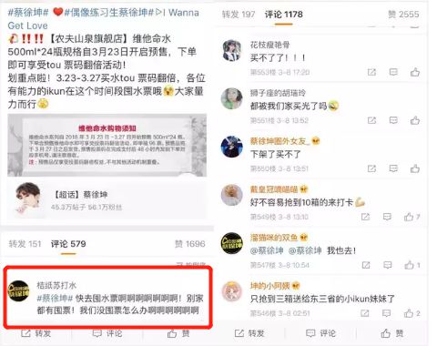 一箱维他命水兑换30票,一箱天然水兑换24票。有的粉丝一天投了4000票,农夫山泉堆在家里根本喝不完。