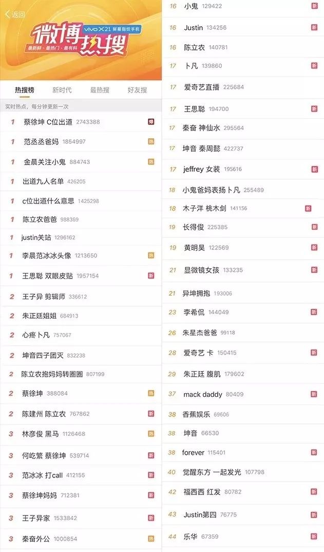 粉丝每天都在注册不同的微博账号,自发组织为自家爱豆轮博,在不到一个月的时间里,就花了近2000万,C位出道的蔡徐坤个人大概就贡献了300多万。