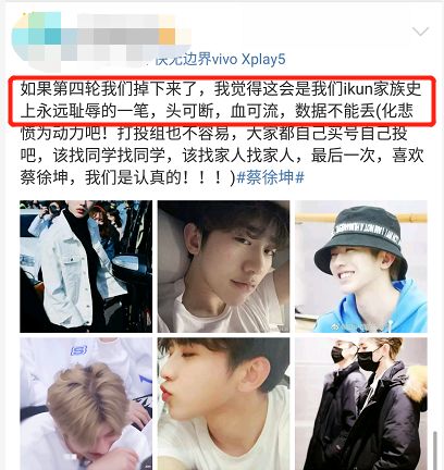 在第四轮投票前,蔡徐坤的粉丝是“如果我们第四轮的投票掉下来,我觉得会是我们iKun家族史上永远耻辱的一笔!”