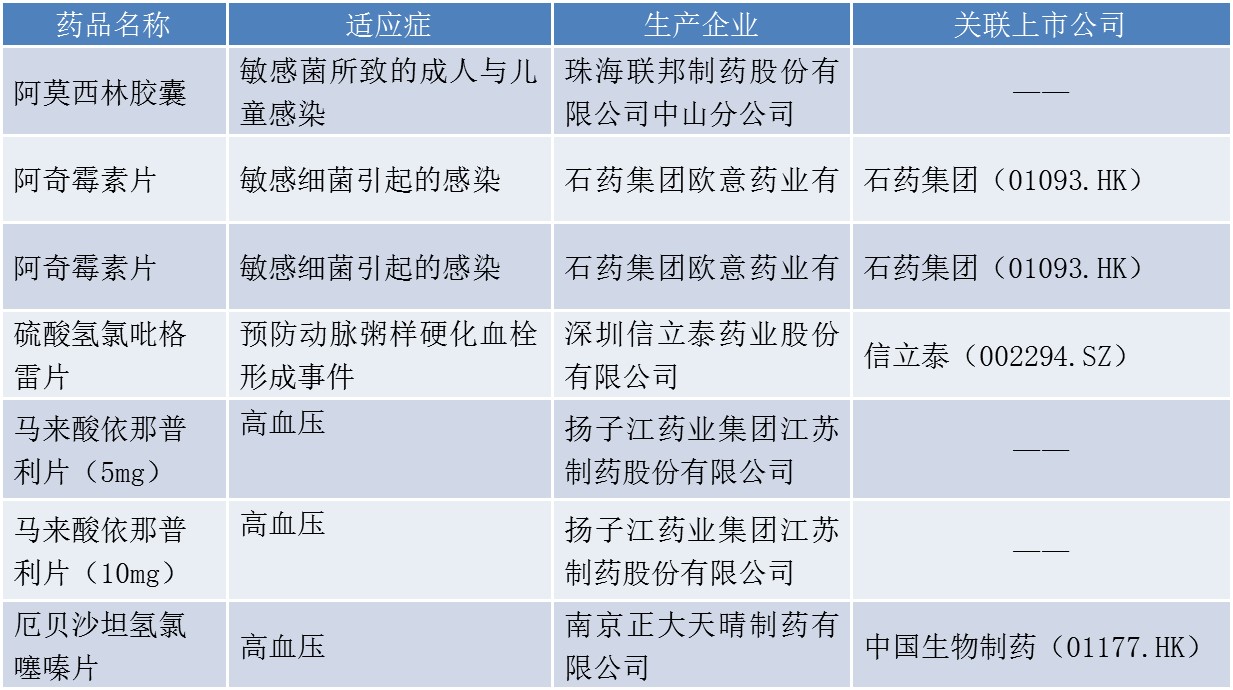另外,国家药品监督管理局还发布了第三批通过仿制药一致性评价的名单(如下图),共涉及5个药品、7个品规,石药集团(01093.HK)旗下欧意药业有限公司的抗感染药物阿奇霉素片和扬子江药业集团高血压药物马来酸依那普利片均有两个规格获得通过;信立泰(002294.SZ)、中国生物制药(01177.HK)旗下的正大天晴、珠海联邦制药各有1个药物进入名单。