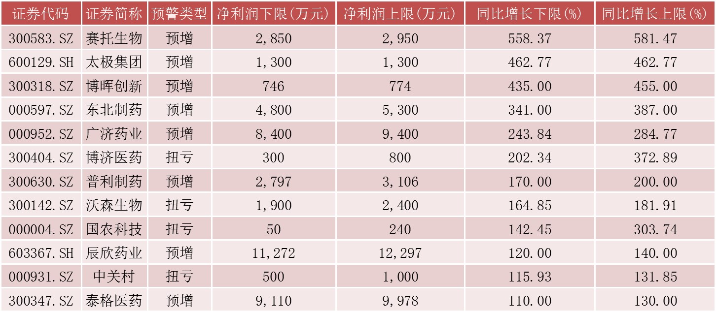 本周还有56家企业发布今年一季度业绩预告,按照净利润增长下限来看,有望实现增长的企业为40家,出现下降的企业有16家。在实现增长的企业中,有12家企业呈现翻倍增长,其中赛托生物(300583.SZ)、太极集团(600129.SH)、博晖创新(300318.SZ)涨幅居于前三甲,同比增长分别为558%、463%、435%。