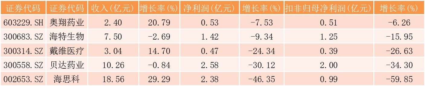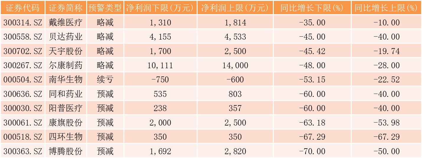 在同比预减的企业中,博腾股份(300363.SZ)、四环生物(000518.SZ)、康旗股份(300061.SZ)下滑最为突出,同比降幅下限分别到达70%、67%、63%。