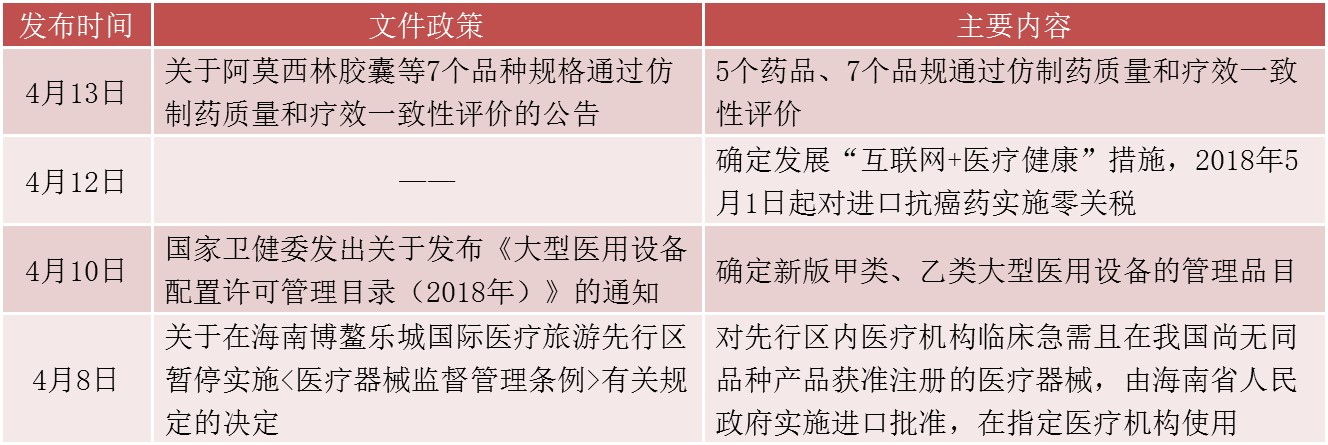 4月12日,国务院常务会议召开,确定发展“互联网+医疗健康”措施,缓解看病就医难题、提升人民健康水平;决定从2018年5月1日起对进口抗癌药实施零关税并鼓励创新药进口;要求加强知识产权保护,保护药品专利。进口抗癌药免关税引起广泛关注,市场观点认为这将有利于降低进口药价格,同时也将促进国内企业加快创新。不过在资本市场上,以恒瑞医药(600276.SH)和复星医药(600196.SH)为代表的国内创新药和仿制药企业股价在4月13日普遍出现大跌。