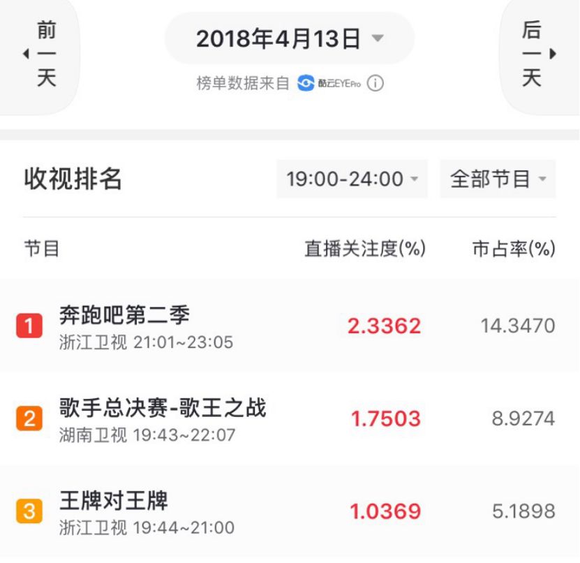 而从收视情况来看,根据猫眼数据显示,《歌手》总决赛平均直播关注度1.75%,当晚恰逢《奔跑吧》首播,直播关注度为为2.3%。在首期节播出当日,《歌手》第二季收视率一度达到2.2%,位居周五全国第一。但相较之前,收视下降是一个始终无法回避的现象,不少新闻报道用“断崖式跌落”来形容《歌手》的收视成绩。
